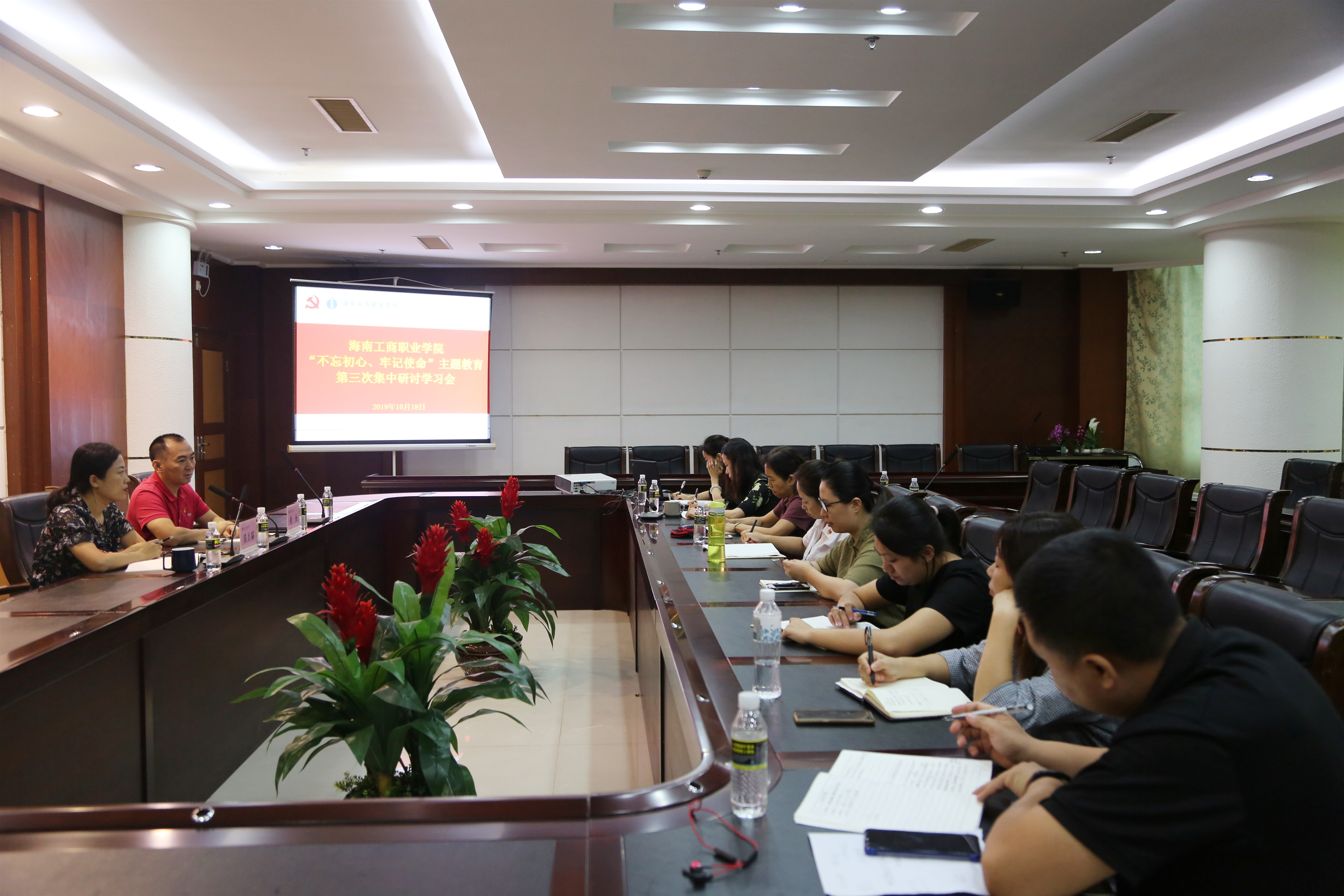本网讯 (通讯员 吴湖)10月18日上午,威尼斯官网召开“不忘初心、牢记使命”主题教育集中研讨学习会,党委书记黄恒,党委委员、副校长陈立丽及全体中层以上党员参加学习会。会议由党委书记黄恒主持。