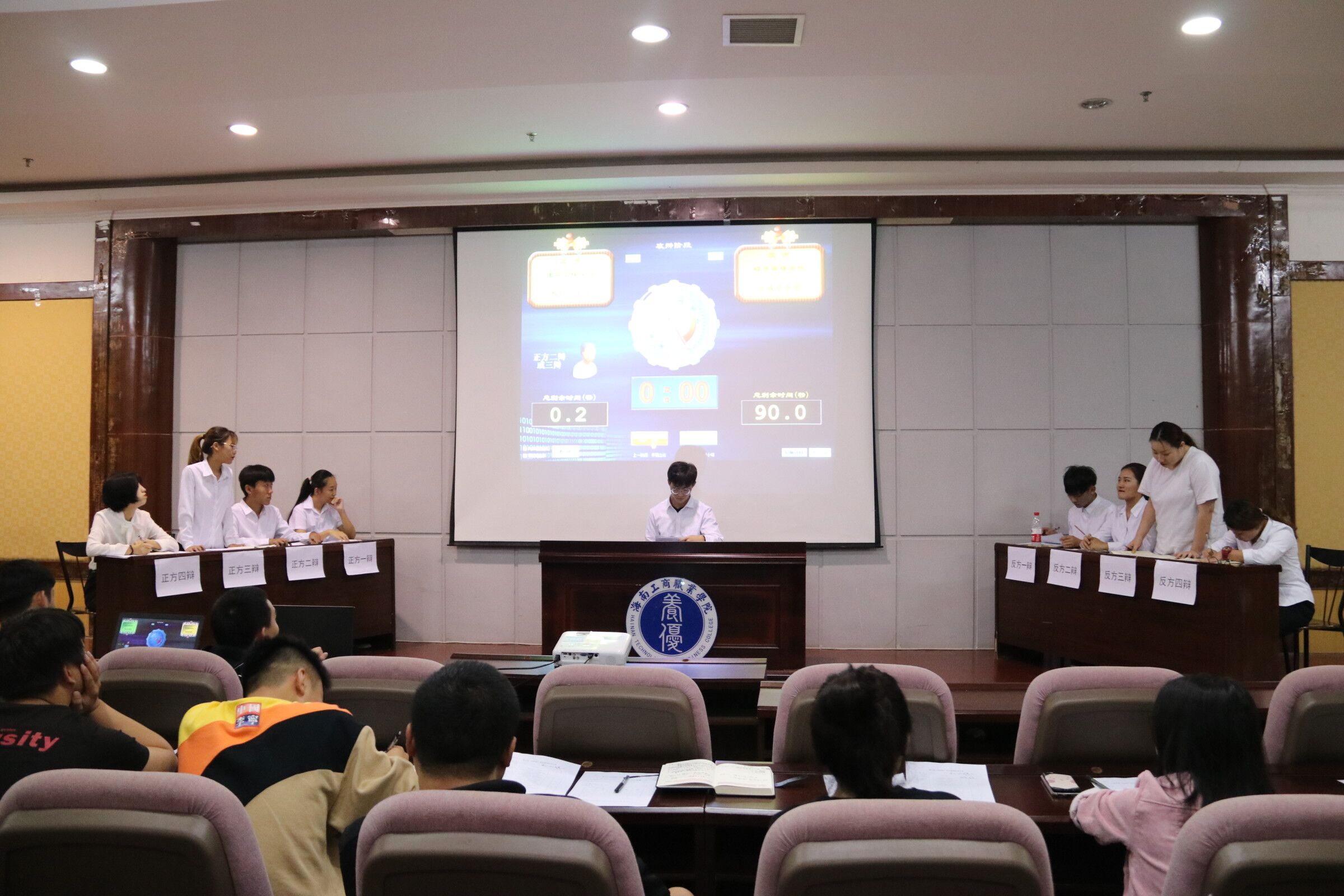 本次辩论赛由团委书记宝晓鹏、经济管理学院林丽媛、旅游艺术学院邢春娅、信息工程学院黄静、海洋学院欧阳雀喜、交通工程学院张博文、学生处王登辉等7位老师担任评委。