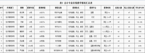 另外,根据学院要求,每天授课结束,老师们需要填写《会计专业在线教学情况汇总表》,学院、学校都及时了解教师授课情况及学生到课率情况,实现实时监督。