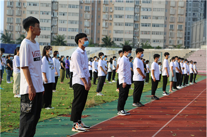 5月13日早7点10分,旭日东升,已返校的海工商2019级各团支部团员代表、辅导员及学生处(团委)负责人戴好口罩,保持安全距离,在学校田径运动场,举行升国旗仪式,这是“开学第一课”的另一重要环节。
